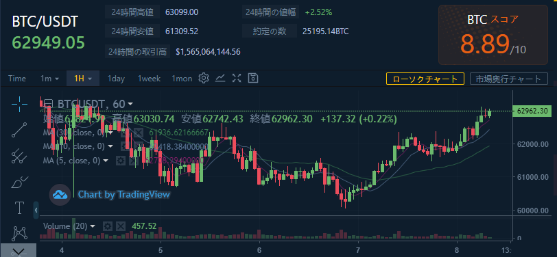 価格:BTC / USDT $62949.05(7,160,125円)