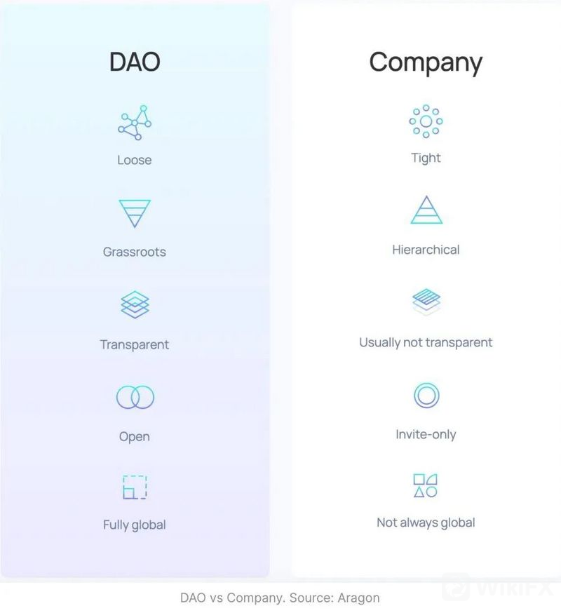 組織形態の観点から見ると、DAOは共通の目標と同様の価値観を持つ人々を集めることができる。例えば、Twitterを始めとしたSNSを介して、顔を合わせなくでも、迅速かつ効率的に様々なタスクを完了させることができる。このようなスキームは従来の組織という概念を覆すものである。
