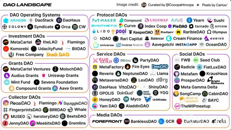 理論的には、どんな組織でもDAOになることができる。投資型DAOと助成型DAOの場合には、様々なプロジェクトに資金を提供することができる。コレクターDAOの場合、NFTのデジタルアートなどのコレクションを集めることができる。ソーシャルDAOなら、メンバーに対して特定のソーシャルサークルを提供できる。