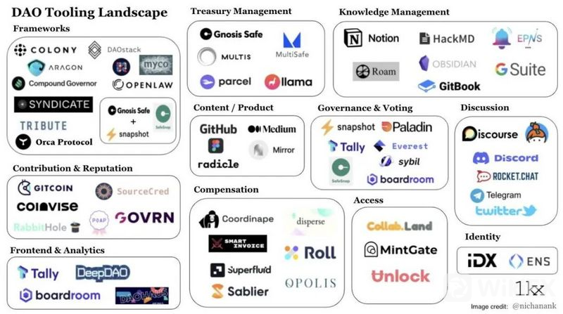 DAOフレームワークは、DAOを作成するための専用な技術ツールを提供する。DAOは、完全なソリューション(Colony、Syndicate、Aragonなど)を使用して作成できる。