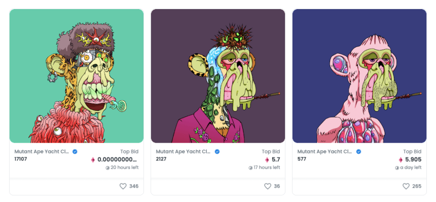 MAYCは、既存のBored Apeに「MUTANT SERUM(血清のようなもの)」というNFTを投与することで作成するか、パブリック・セールで手に入れることができるミュータントバージョンのBored Apeだ。最大2万個のNFTコレクションである。MUTANT SERUMは、Bored Ape NFT保有者にエアドロップされたが、OpenSeaの「Bored Ape Chemistry Club(BACC)」でも購入可能だ。
