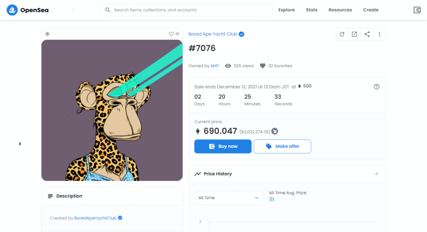 NFTマーケットプレイスのOpenSeaでは12月9日現在、50ETH(2500万円相当)前後の価格の出品が多いが、中には数億円の価格で出品されているものも見られる。
