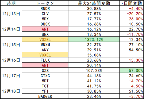 12月13日ー12月18日、毎日上昇Top3の情報まとめである。