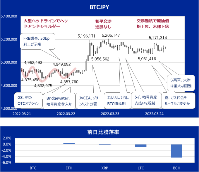 昨日のBTC相場は高値圏でのもみ合い。n一昨日に41,000ドル(約485万円)近辺から急上昇するも、43,000ドル(約520万円)台で2度上値を抑えられると、その後は概ね42,000ドル(約510万円)台での取引に終始した。nGS(ゴールドマンサックス)のOTC(店頭取引)でのオプション取引実施やヘッジファンド最大手Bridgewaterの暗号資産市場参入報道を受け、BTCは下向きの小さなヘッドアンドショルダーを形成、43,000ドル台まで上昇した。nしかし、43,000ドル台で2度跳ね返されると、ウクライナでの和平交渉において目立った進展が無かったことから徐々に上値を重くしていった。n更に、発行市場の悪化を理由にエルサルバドルが「BTC債」発行を延期、タイの証券委員会が同国内での暗号資産の支払での利用を制限したことなどもあり、BTCは下落するも、42,000ドル近辺でサポートされた。nその後、ウクライナ政府高官が和平交渉は重大な困難に直面とコメント、ロシア側は交渉を妨害していると米国を避難するなど交渉が難航、米大統領が出席するNATO総会・G7で更なる制裁強化が予想される中、原油価格が上昇、米株は下落、BTCの上値は抑えられ、概ね42,000ドル台での取引が続いた。nなお、エルサルバドルに続きホンジュラスがBTCを法定通貨に採用するのではないかとの噂が出ていたが、今朝方、同国中銀が否定している。