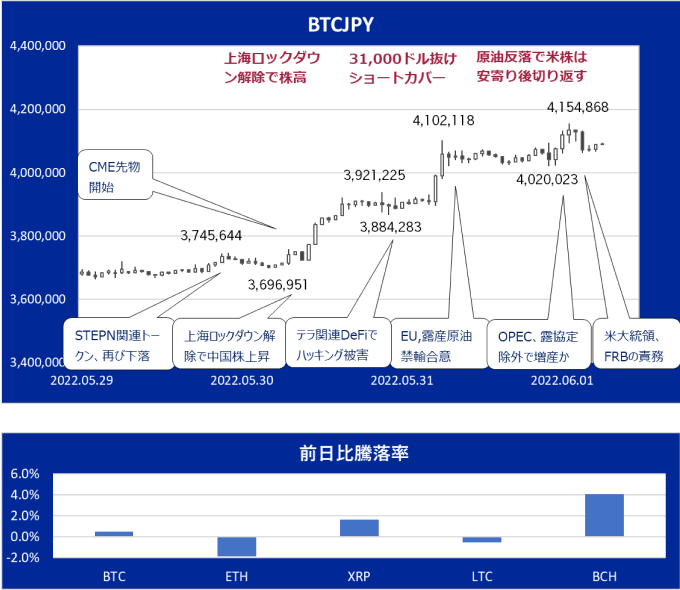 WikiBit 2022-06-01 00:20BTC相場は、株価動向をみながら、予断を許さない展開が続こうが、ここ2週間のレンジを上抜けしていることから、一旦は上値余地を探る展開を予想する。