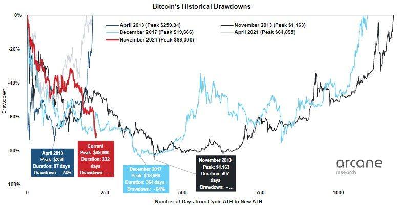 Historical drawdowns for Bitcoin. Source: Arcane Research