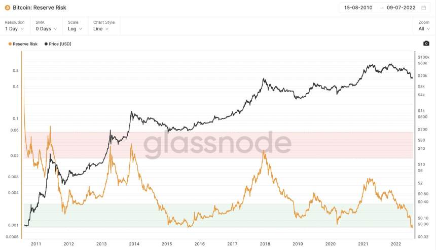 週末にコメンテーターのMurad氏が指摘したように、長期保有者のセンチメントを示すリザーブリスクは、7月の価格で過去最低のレベルを記録した。
