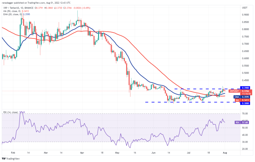 XRP価格は、7月30日と31日に0.39ドルの直上のレジスタンスを上回ったが、強気派は高値を維持することができなかった。これは、弱気派がまだ諦めておらず、積極的に0.39ドルレベルを守り続けていることを示唆している。