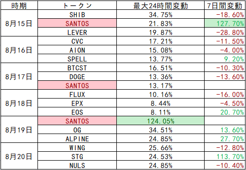 8月15日ー8月20日、毎日上昇Top3の情報まとめである。