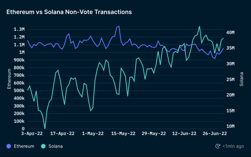 2022年第2四半期のオンチェーンデータでは、マクロ経済状況とネットワーク停止の両方からの様々な欠点にもかかわらず、ソラナ(SOL)がユーザーの1日の取引でイーサリアムを上回っており、ハイプは必ずしも普及率と一致するわけではないことが示されている。