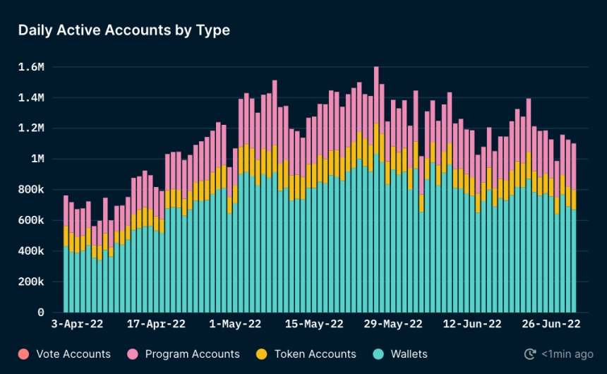 投票トランザクションを考慮すると、ソラナは1日あたりおよそ1億から2億のトランザクションを記録し、これはウォレットの総数の急増、つまり40万ウォレット前後から2022年5月末にかけて100万ウォレット近くまで増加したことによって裏付けられている。