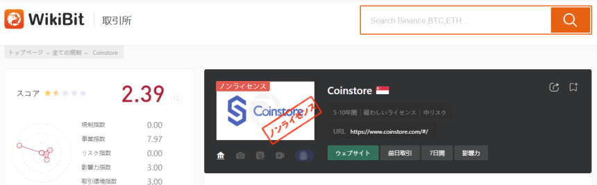 WikiBitにはCoinstoreに関するクレームがないが、ライセンスを取得していないこともあるので、慎重に取引を行ってほしい。