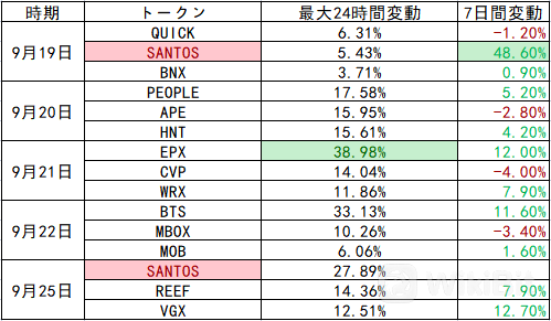 9月19日ー9月25日、毎日上昇Top3の情報まとめである。