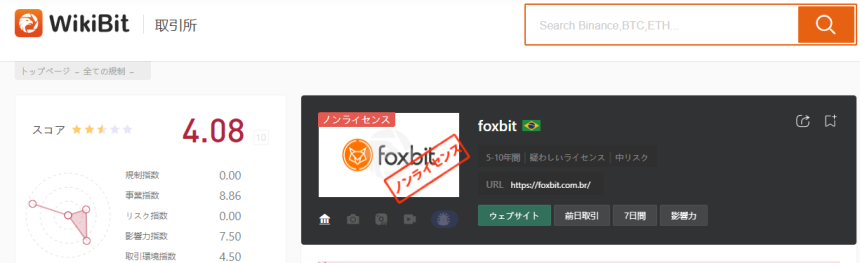 WikiBitにはFoxbitに関するクレームがないが、ライセンスを取得していないこともあるので、慎重に取引を行ってほしい。