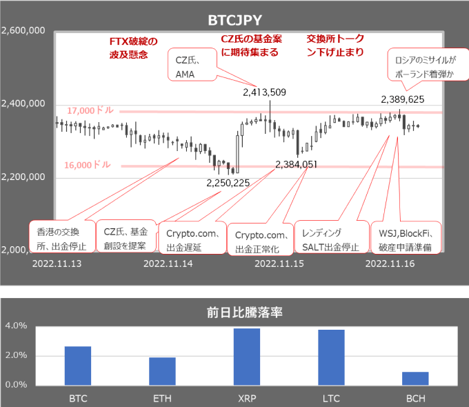 弱かった米PPIを受け17,000ドルを回復、高寄りした米株を受け暫く17,000ドル台での取引が続いたが、ロシアのミサイルがNATO加盟国であるポーランドに着弾したとの報を受け米株が失速、暗号資産業界でもWSJがBlockFiが破産申請を準備していると報じ、BTCは値を下げたが、16,000ドル台後半での取引が続いている。