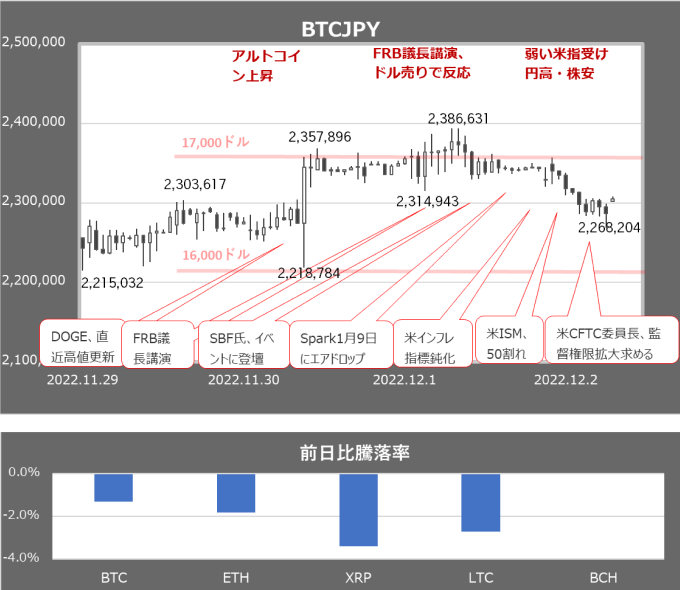 WikiBit 2022-12-02 02:03一昨日17,000ドル(約230万円)台に乗せると、昨日も戻り高値を更新。その後失速しするもドル建てでは17,000ドル近辺でのもみ合い推移となっているが、ドル売り円高の影響で円建てではやや値を下げている。