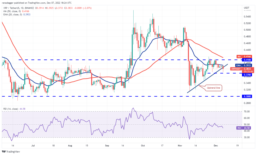 弱気派はここ数日、20日間EMA(0.39ドル)で抵抗し、12月7日にXRPを上昇トレンドラインの下に引きずり込んだ。これは、発展途上の上昇トライアングルパターンを無効化するものだ。