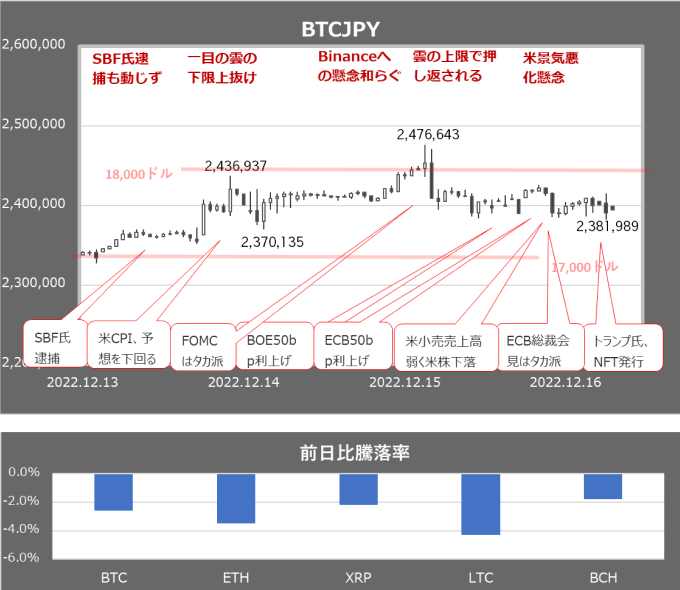 更に米小売売上高、NY連銀景況感指数ともに大きく予想を下回ると米株先物が下落、BTCも17,000ドル前半に値を下げた。