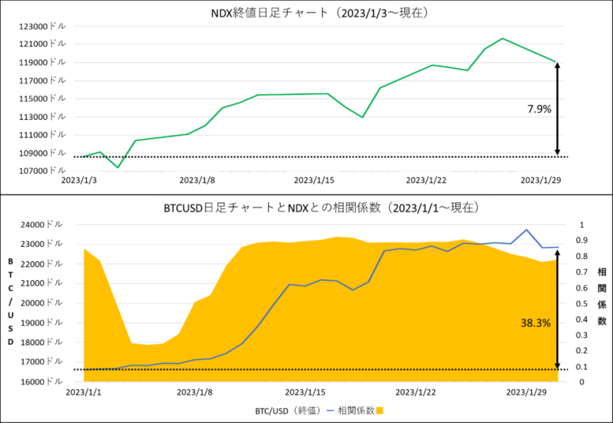 上図の通り、NDXは1月頭から約7.9%上昇、NDXとの相関関係を取り戻したBTC/USDは約38.3%上昇した。
