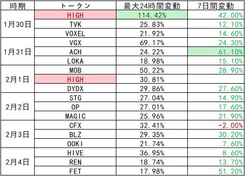 1月30日ー2月4日、毎日上昇Top3の情報まとめである。
