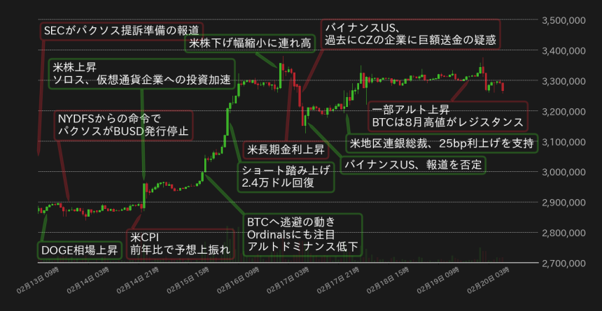 ドル建てで200週移動平均線の走る節目の25,000ドルや、昨年8月高値の25,200ドルが密集するエリア(≒336万円〜338.7万円)の上抜けを試した先週16日のBTCは、1月の米生産者物価指数(PPI)と新規失業保険申請件数が市場予想を上回ったことで、米長期金利の上昇に上値を圧迫され反落。さらに、バイナンスの米国法人が2021年にCZが経営するとされるトレーディングファームに537億円もの巨額の資金を送金していたとロイターが報じたことで、相場は下げ足を速めた。