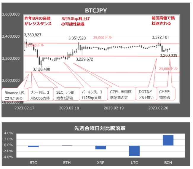 WikiBit 2023-02-20 00:18週末のBTC相場は上値の重い展開。