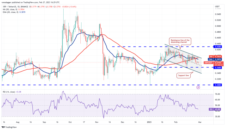 20日EMA(0.38ドル)は下降に転じ、RSIはマイナス圏にあるため、目先は弱気派がやや優勢だ。0.36ドルを割り込んだ場合、XRP/USDTペアは下降チャネルのサポートラインまで下落する可能性がある。