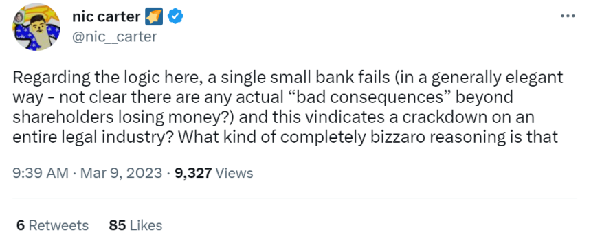 一方、ベンチャー企業キャッスルアイランドと仮想通貨情報会社コインメトリックスの共同創業者であるニック・カーター氏は、シルバーゲートに対して調査や法的攻撃を仕掛けて「崩壊を早めた」のは政府であると指摘した。同氏は「放火魔と消防士がひとつになったような存在」だと政府を批判している。