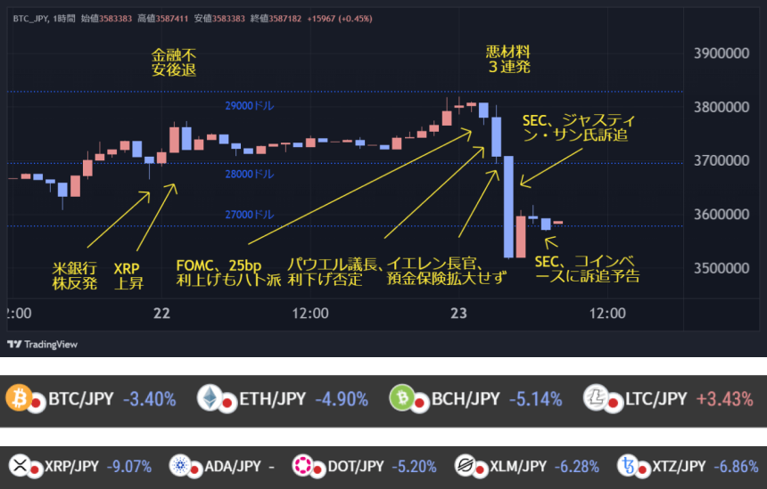 続く記者会見でパウエル議長は利上げ休止を検討したとし、BTCは上昇に転じたが、年内利下げを見込んでいないと明言すると失速。同じ頃、上院の公聴会でイエレン米財務長官が預金保険の対象拡大は考えていないとしたことから銀行株が失速、リスクオフ気味にBTCは27,000ドル台前半まで値を下げた。