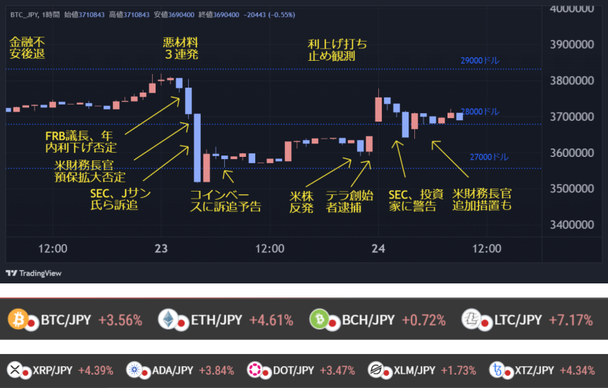 その後、BTCは27,000ドル台に値を戻すも、SECがコインベースに証券法違反で訴追する可能性があるとの予告を発行したことが伝わると、BTCの上値は抑えられた。