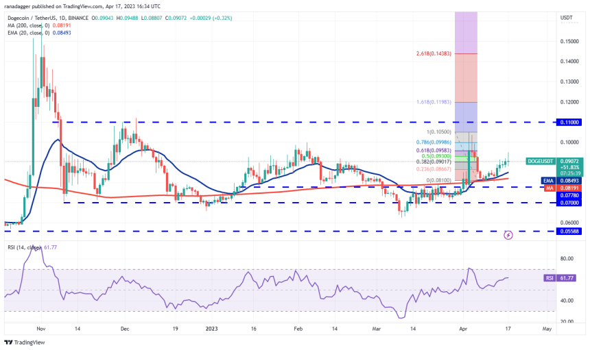 ドージコインは、4月14日から16日にかけて、弱気派が0.09ドルの38.2%フィボナッチリトレースメントレベルでリカバリを阻止しようとしたが、買い手は売り手に譲らなかった。