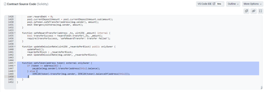 デプロイアカウントは、OFIステーキング契約に対してトークンを自分に転送するように複数回呼び出しを行っており、「ownerRewithdraw」と呼ばれる行305-308の機能を使用していた。これは、契約内の残高が「totalOwedValue」と呼ばれる変数よりも大きい限り、オーナーがステーキング契約から任意の量のトークンを引き出せるようにするものとみられる。
