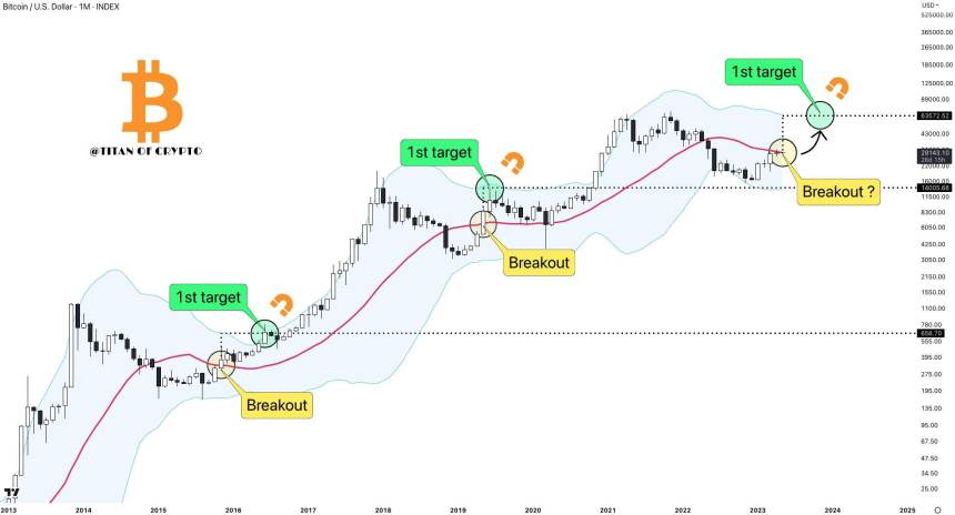 先述のタイタンオブクリプト氏によればビットコインは各半減期サイクルで1回しか起こらない「ブレイクアウト」に向けて動いているという。2016年と2019年にもボリンジャーバンドチャネルの上部に突入し大きく上昇したという。