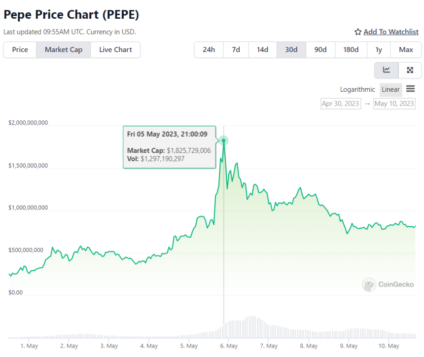 10億ドルに到達した後、PEPEはDOGEと似たような動きを見せた。5月5日に10億ドルに達した後、同じ日に市場価値はほぼ20億ドルに迫った。しかし、時価総額が18.2億ドルに達した後、トークンの時価総額は5月9日に7億2500万ドルに急落した。