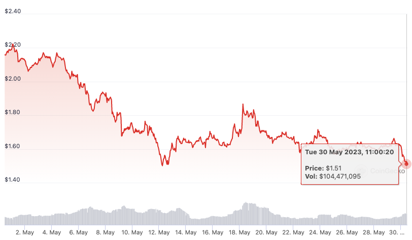 エアドロップが取引活動の短期的なスパイクを引き起こしたものの、OPトークンの価格は過去数ヶ月間全般的に下落トレンドにあった。また解除イベントを前にして短期的に大きな打撃を受け、現在1.51ドルで取引されており、過去24時間で8.5%下落している。