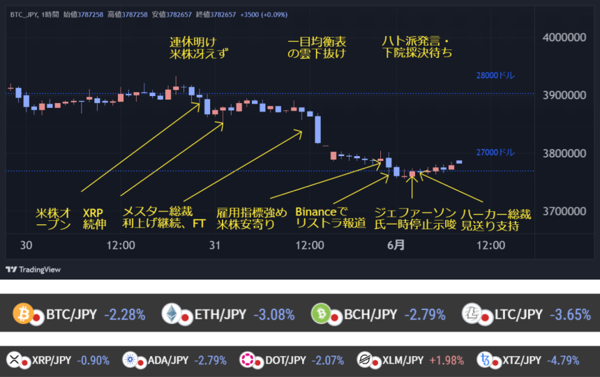 Binanceは人材の入れ替えでリストラでないと否定したこともありBTCは下げ止まると、金融政策担当の副議長に指名されているジェファーソンFRB理事が利上げを一時停止して更にデータを見るべきとコメント、フィラデルフィア連銀のハーカー総裁も6月FOMCでの利上げは見送るべきとコメントするとBTCは27,000ドル台に値を戻している。