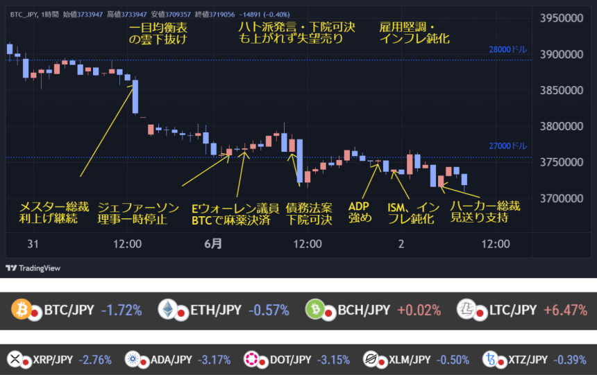 一昨日のFT紙によるクリーブランド連銀のメスター総裁のタカ派発言報道などもありBTCはドル建てで一目均衡表の雲を下抜けると27,000ドル台前半に失速、一時26,000ドル(約360万円)台に値を下げた。