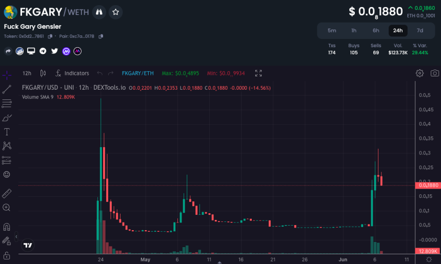 同様に、ゲンスラー氏をモチーフにした別のミームコイン「ファック・ゲイリー・ゲンスラー(FKGARY)」も上昇し、DEXToolsのデータによると、過去48時間で530%以上も値上がりした。