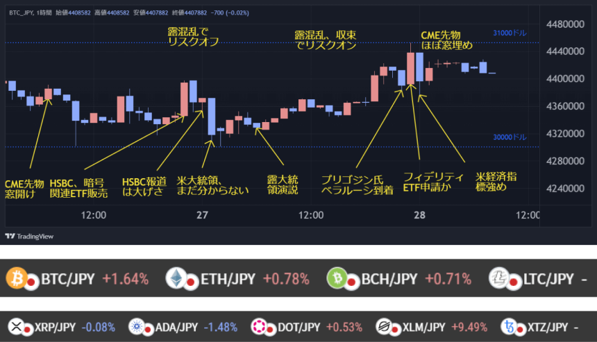 週明けの米株市場はロシアの混乱を嫌気して軟調に推移、BTCも上値の重い展開が続いた。バイデン大統領が反乱の関与を否定、同時に結果はまだ分からないとしたことも市場の重石となったか。