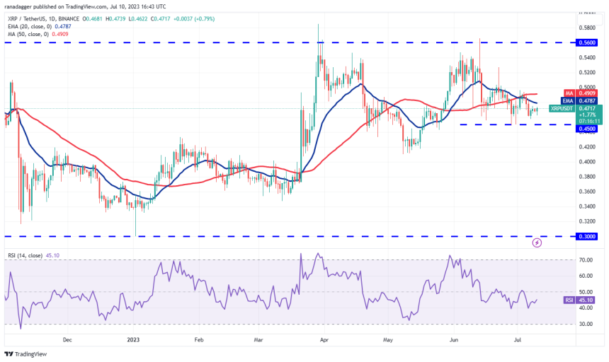 20日移動平均線は下向きで、RSIはネガティブ圏にある。これは、弱気派が優位であることを示している。売り手は価格を0.45ドルのサポート以下に引き下げることで地位を強化しようとするだろう。もし成功すれば、XRP/USDTペアの調整は次のサポートである0.41ドルまで深まるかもしれない。