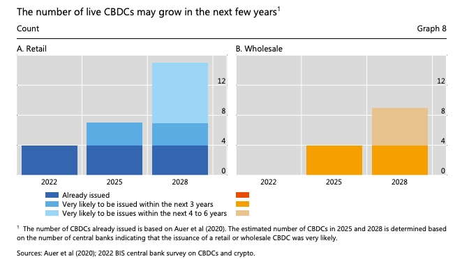 国際決済銀行(BIS)の調査によると、中央銀行の93%が既に中央銀行デジタル通貨(CBDC)に関する研究を行っており、2030年までに15のリテール型CBDCと9つのホールセール型CBDCが流通する可能性がある。