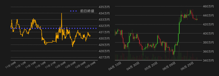 11日のビットコイン(BTC)対円は、ドル安円高が相場の重石となり小幅に反落した。本日午後9時半に発表される6月の米消費者物価指数(CPI)の伸び鈍化が期待されるなか、昨日は東京時間から欧州序盤にかけて米債利回りが低下し金(ゴールド)相場が上昇。これを受けて、BTCも対ドルではジリ高に転じたものの、外国為替市場でドル安円高が進行したことで、円建て相場の上値は圧迫され、430万円台前半で揉み合いの末、一時は430万円を割った。米時間に入ると、米株の上昇に連れて反発するも、30,800ドル水準となる434万円で売りが入り失速。その後、BTC相場は430万円周辺での揉み合いに終始した。
