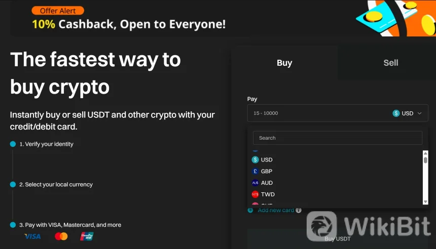 Bitgetは、EUR、USD、GBP、AUD、TWD、CHF、UAH、BRL、TRY、ARS、AED、AFNなど、さまざまな地域のユーザーが簡単にUSDT、BTC、BGB、ETH、XRP、USDCなどの暗号通貨を購入できるよう、幅広い法定通貨をサポートしています。