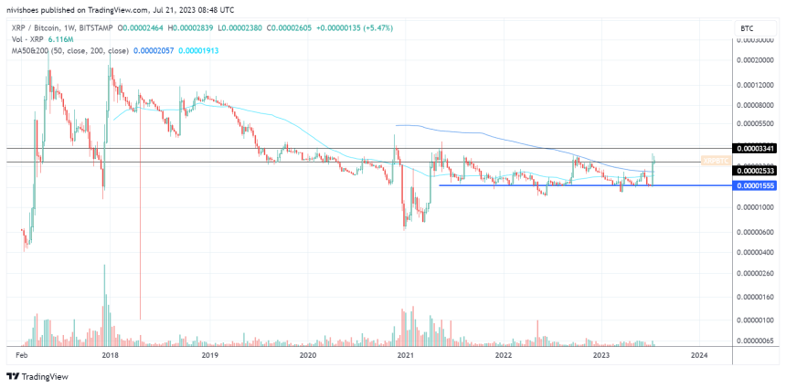 XRP/BTCペアもまた、0.00002533 BTCと0.00003341 BTCの間の長期的なレジスタンスレベルに張り付いている。買い手は2019年以来、このレベルを超える動きを見せていない。このレベルでのサポートを築くことができなければ、ペアはおそらく0.00001555BTC付近のサポートを再訪する可能性がある。