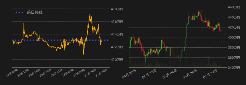 26日のビットコイン(BTC)対円はほぼ横ばい。ドル建てでは小幅な上昇(+0.44%)となった。米連邦公開市場委員会を控え、この日のBTC相場は東京時間から米市場中盤まで概ね413万円周辺での推移が続いた。注目されたFOMCでは、市場の予想通り25ベーシスポイント(bp)の利上げが決定され、声明やパウエル米連邦準備制度(FRB)議長の記者会見からもタカ派的なサプライズはなく、BTCは一時上値を試す展開となったが、7月以降の政策方針に不透明感が残ったからかすかさず上値を重くし、29,700ドル(≒417.7万円)手前で反落。ドル円相場の下落も円建てBTCの上値圧迫要因となり、終値ベースでは僅かに下落する格好となった。