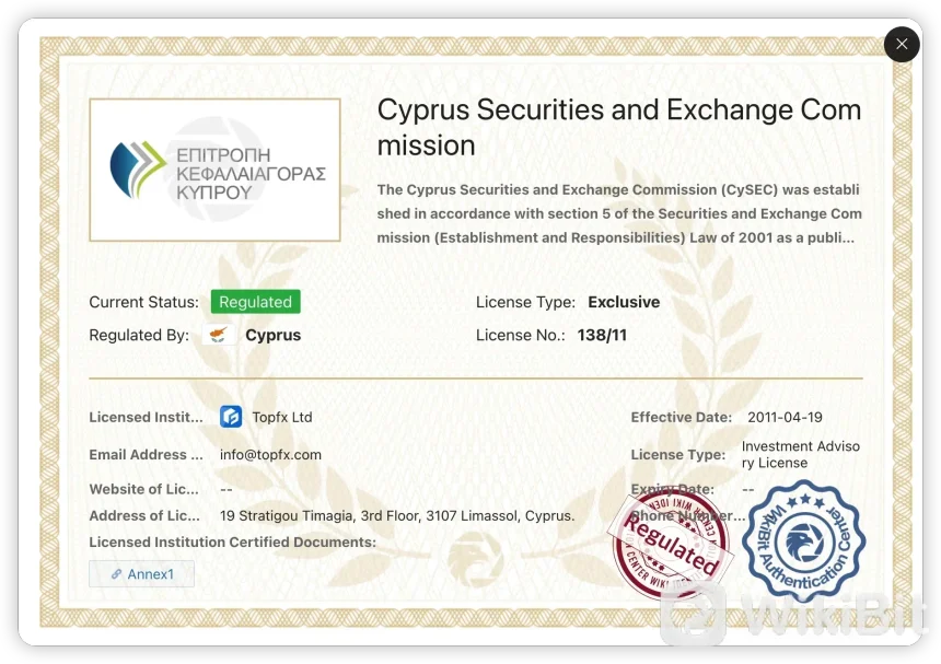 | 規制当局 | キプロス証券取引委員会 (CYSEC) |