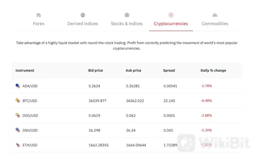 Derivは、30種類以上の多様な仮想通貨にアクセスできるようにしており、デジタルアセットの進化する風景に対応しています。利用可能なオプションには、Bitcoin(BTC)、Ethereum(ETH)、Litecoin(LTC)、Bitcoin Cash(BCH)などの主要な仮想通貨が含まれます。選択肢はEOS(EOS)、Cardano(ADA)、Solana(SOL)、Dogecoin(DOGE)などのアルトコインにも広がり、さまざまな市場露出を求めるトレーダーに選択肢を提供しています。その他の提供物には、Polkadot(DOT)、Avalanche(AVAX)、Binance Coin(BNB)などもあります。