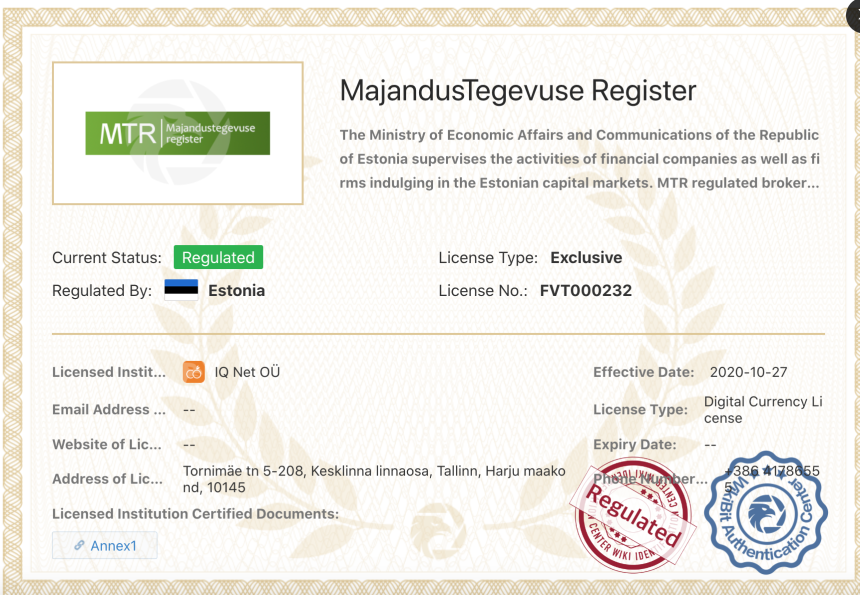 取引所の規制状況は、MajandusTegevuse Register (MTR) と呼ばれる規制機関によって監督されています。この取引所は規制されており、規制番号 FVT000232 が付与されています。 IQ Net OÜ が発行したデジタル通貨ライセンスに基づいて運営されています。したがって、取引所は規制要件を遵守しており、運営に必要なライセンスを保持しています。