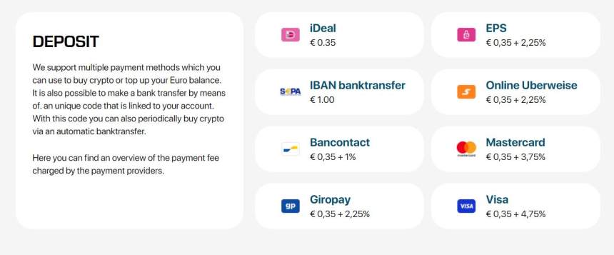 Knakenは、暗号通貨取引に参加するために入金を容易にするための複数の支払い方法を提供しています。これらの方法には、iDeal、EPS、IBAN銀行振込、オンラインUberweise、Bancontact、Mastercard、Giropay、Visaが含まれます。各支払い方法には手数料と処理時間が関連していますので、口座に資金を供給する際に考慮する必要があります。