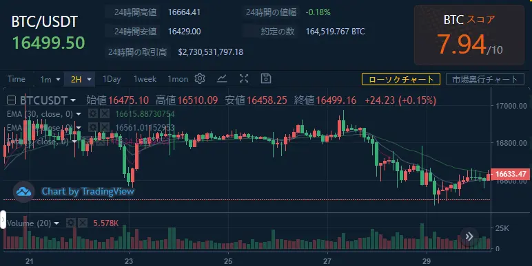 本日のBTCチャートとトークン上昇率Top3